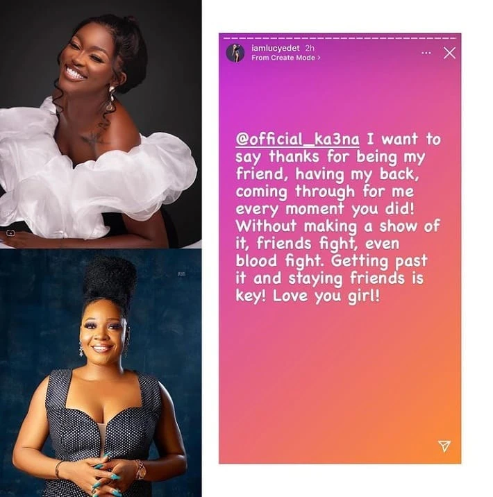 Barely 48 hours after the episode debuted, Lucy took to her Instagram story declaring love for Ka3na amid their differences.